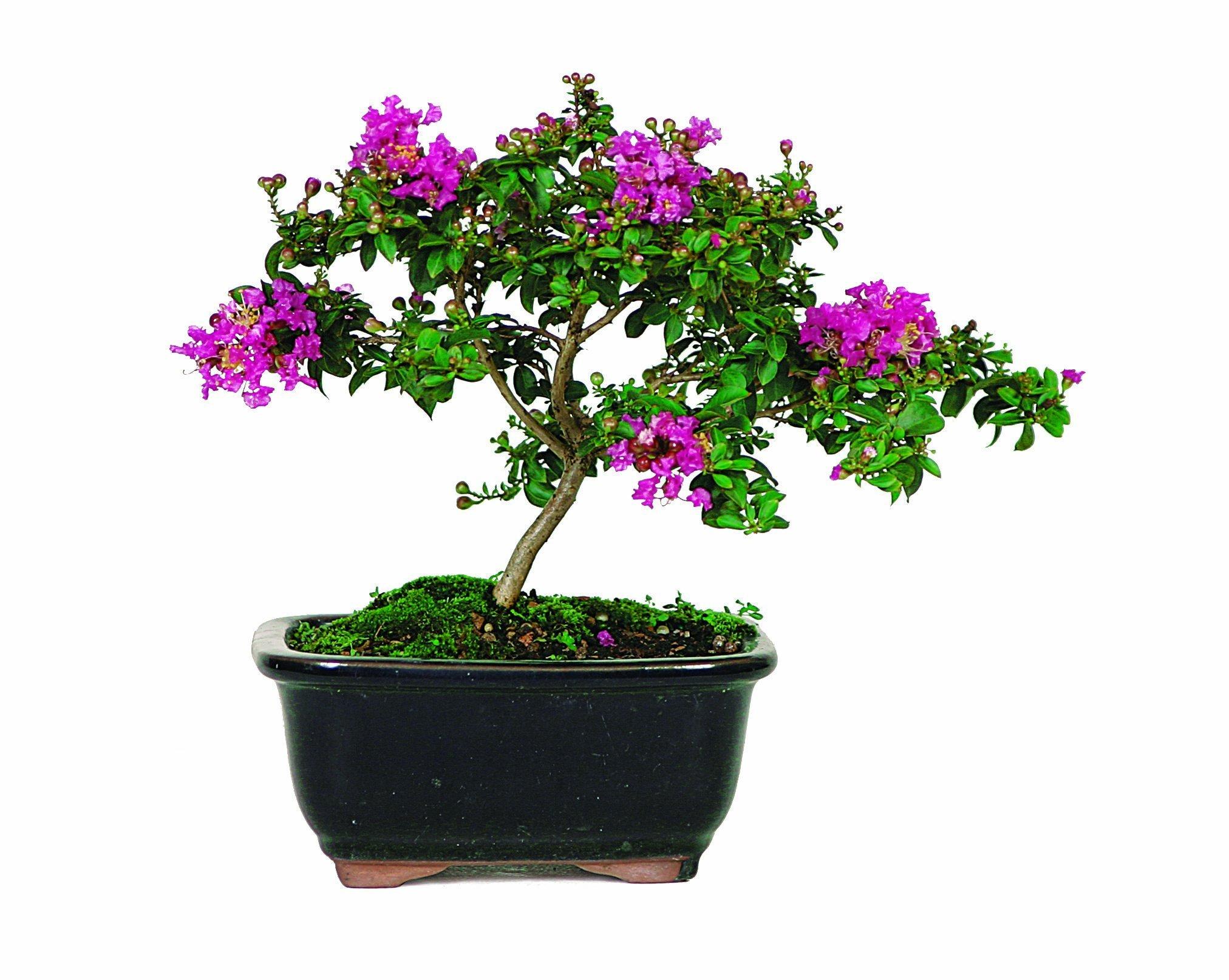 With delicate, crinkled vibrant pink/purple flowers blossoming mid to late summer, the Dwarf Crepe Myrtle bonsai tree adds welcome color to any deck, patio or garden. The flowers have six or seven crinkly-edged petals on stalks, sticking out between the sepals, which are simple triangular points. The flowers occur in spike-like clusters. The tree's sinewy, fluted stems support opposing leaves with entire margins. Grown in Chinese nurseries under carefully controlled conditions, and developed at U.S. National Arboretum, this tree is 5 years old and 7 inches tall.