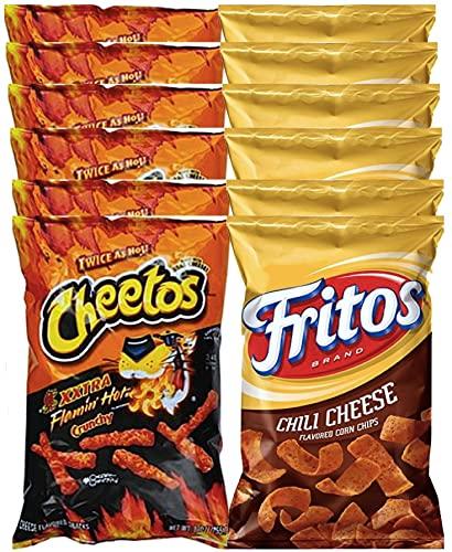 Cheetos Crunchy Xxtra Flamin’ Hot & Fritos Chili Cheese Corn Chips Snack Care Package for College, Military, Sports Approxiamtely 8.0 Oz (12)