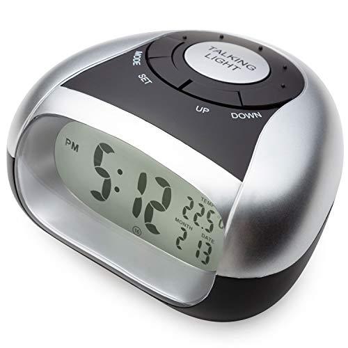 Hearing the time and indoor temperature has never been easier! You don't have to press a button - The Talking Alarm Clock with Temperature is designed so that a soft touch activates the time/temperature announcement in a female voice. In addition to the on-demand time report, you may choose to have an hourly chime announcement either throughout the day, or for just 16 hours a day (from 7:00am to 10:00pm.) Or, you can turn the hourly chime function off entirely. The clear LCD display shows time, temperature, month and day, and a green backlight may be activated for convenient nighttime viewing. You may choose to have time displayed in either a 12 or 24-hour format and to have the temperature shown in Celsius or Fahrenheit. The alarm features a snooze option and a choice of waking an alarm beep or a musical chime. The Talking Alarm Clock with Temperature is the ideal choice for the Blind and those with Low Vision as the elderly, those with limited dexterity and anyone looking for a stylish, easy-to-use clock. The arthritic and those with Parkinson's and other dexterity challenges will appreciate the sensitivity of the clock. Features and Functions: * Announces time/temperature on demand and hourly * Normal/Time Display: hour, minute, month, day and temperature (Covers date range: January 1, 1990 to December 31, 2199) * Displays time in 12 or 24-hr format * Displays current indoor temperature in Celsius or Fahrenheit * Alarm and Snooze: Wake to alarm beep or musical chime * Hourly chime: time/date report, musical chime or turn off * Large 3-1/8" x 1-1/4" oval LCD display with backlight * Announces numbers as you're setting time and alarm * Uses 2 AA batteries (not included)