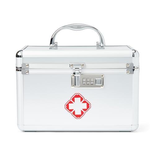 Lock box has a programmable thumbwheel combination lock for increased security Removable compartments and shelf piece allow for flexibility with organizing medicine bottles and pills Designed with ergonomic handle for carrying ease when traveling