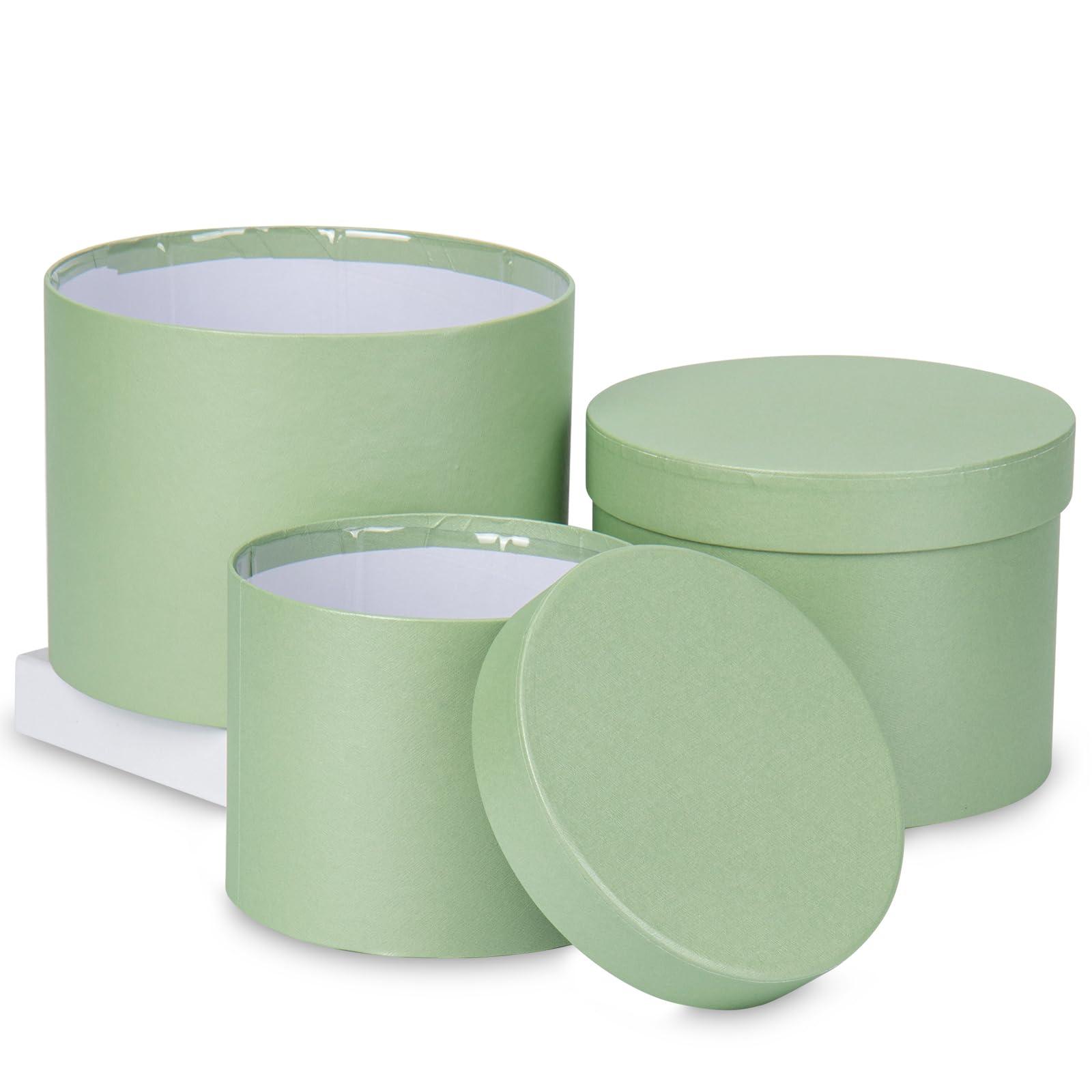 - Green Gift Box Set -A set of 3 luxury gift boxes with lids for your option to fit different needs. Large gift box : 7.5"Dia x 5.7"H; medium nesting gift boxes: 6.5"Dia x 5.1"H; small gift box: 5.5"Dia x 4.3"H. Round boxes for flowers do not need to spend time to assemble, you can use them directly, bring much convenience for you to prepare gifts. Tip: No other decorations included.
