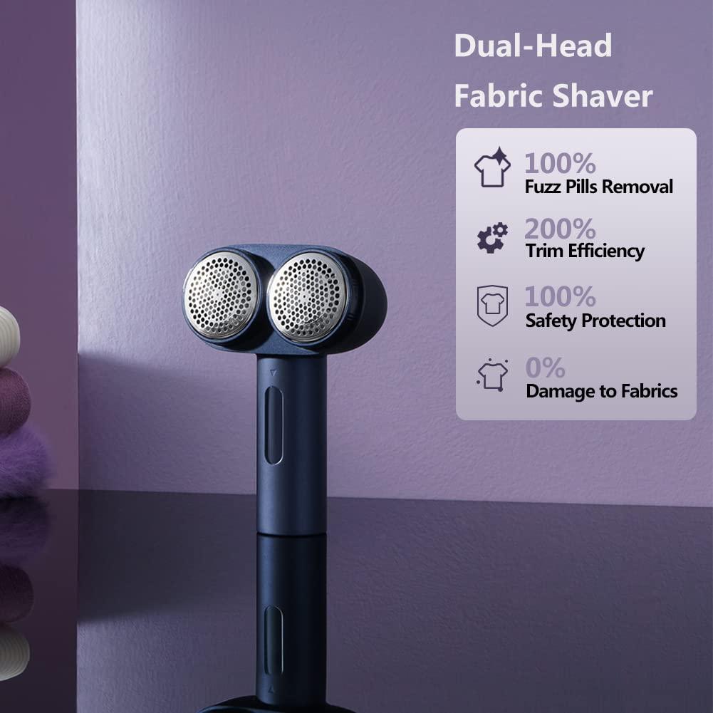 - INNOVATIVE DESIGN: Dual-Head Fabric Shaver with Green light aided identification, Using the premium materials and fine finishing, Combined with durable and advance technology, Efficient removing lint. The Dual efficient motor that shaves off and leaves the sweater clean and lint-free like newly bought. it will never break or damage easily.
