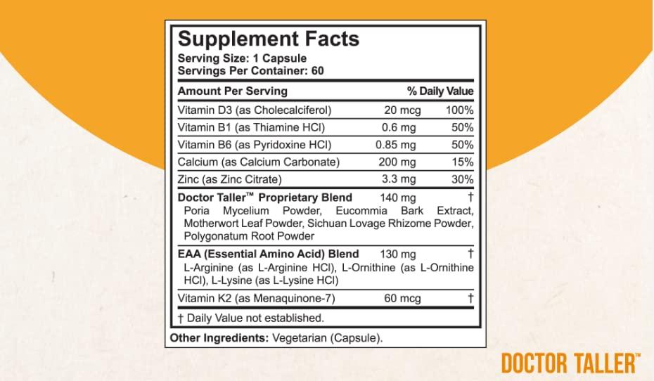 - Vitamins and Minerals in Doctor Taller: Doctor Taller provides a set of six vital vitamins and minerals that support bone strength, stronger bone, grow taller and height growth, and overall health as well. Vitamins D3 & Vitamin K2 help promote Calcium absorption while B vitamins support brain health, brain booster. Calcium and zinc enhance bone mineral density and build strong bones thereby promoting height growth.*