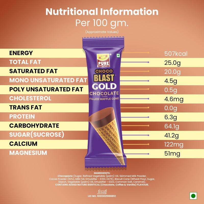 Pure Temptation Gold Chocoblast Waffle Cones Details: Creamy Texture with Crunchy Waffle Cones No Refrigeration Needed Can Be Stored at Room Temperature Gluten-Free Snack 0% Trans Fat No Artificial Colors or Flavors Egg-less and 100% Vegetarian Individually Wrapped Pack for Travel Convenience ISO and HACCP Certifed Food Products Ideal Gift for Any Occasion