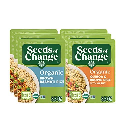 - Three 8.5 OZ pouches each of SEEDS OF CHANGE Certified Organic Quinoa and Brown Rice with Garlic and Whole Grain Brown Basmati Rice