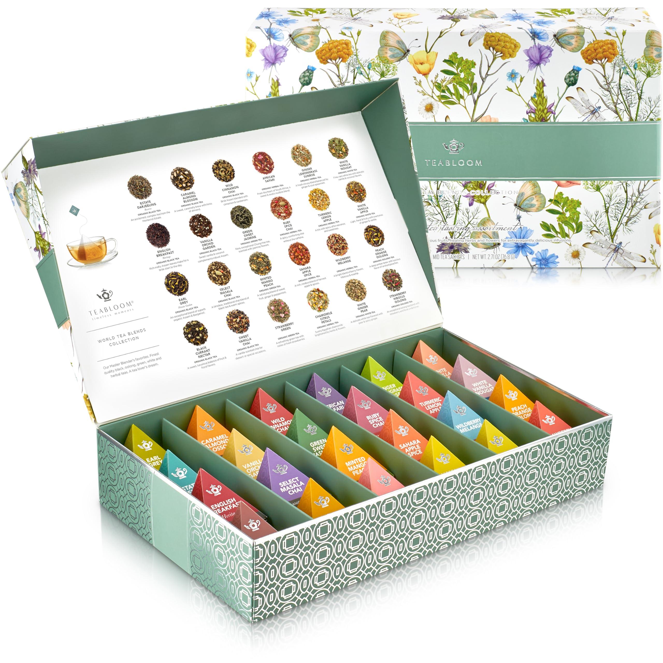 - WORLD'S LARGEST VARIETY PYRAMID TEA COLLECTION. Curated collection with 24 organic black, green, white, oolong, and herbal tea blends. The open lid reveals a detailed tea menu for easy flavor selection.