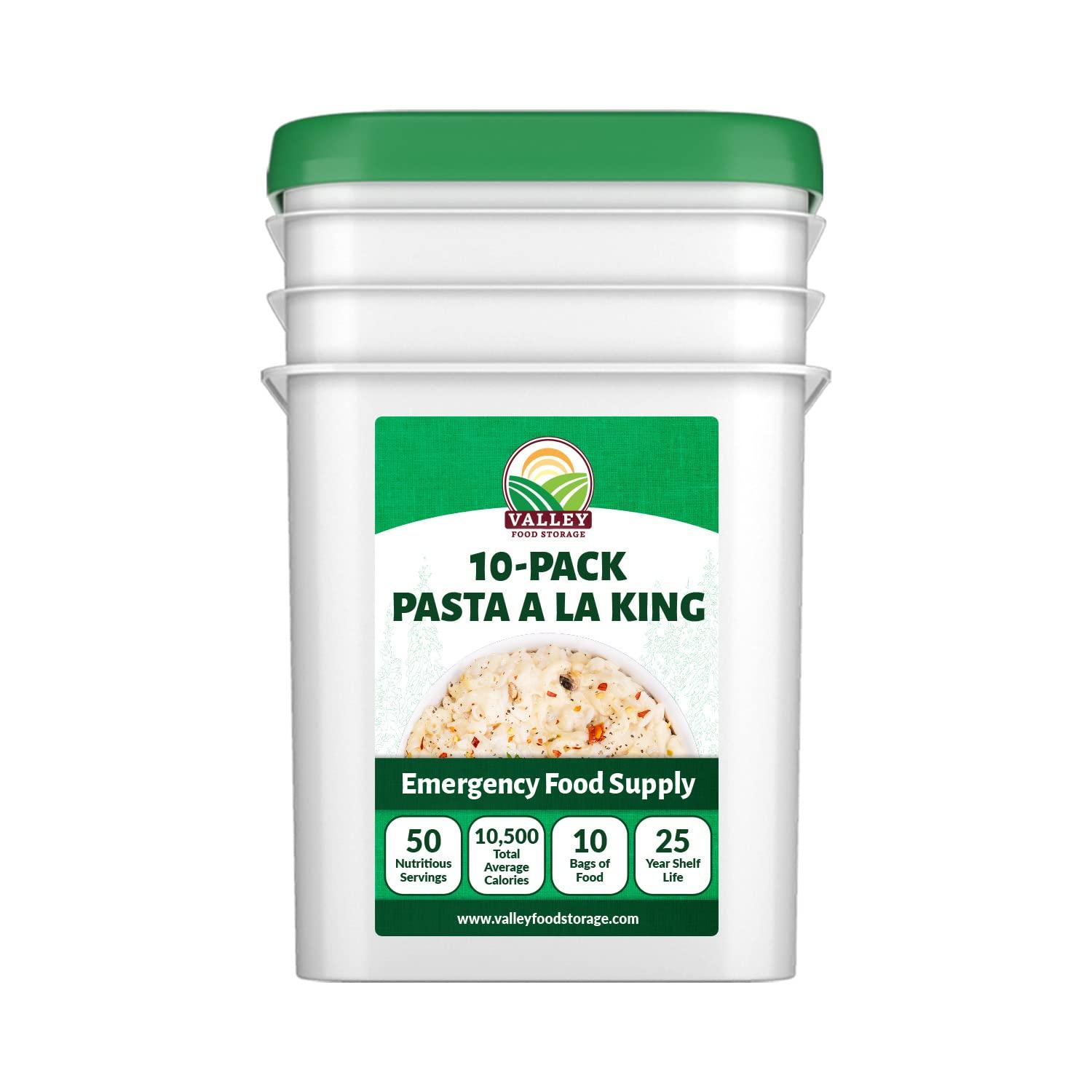 Who says survival food can't be delicious? Enjoy a hearty meal wherever you are with Pasta A La King from Valley Food Storage. Our bucket includes 10 pouches of entrees, each with 5 servings for a total of 10,500 calories, so you can have as much or as little as you need at the ready. Through freeze-drying and other natural preservation methods, Valley Food Storage is able to offer you high-quality, all-natural food with no added fillers or artificial preservatives, resulting in nutritious calories that will keep you feeling strong and healthy. Not to worry, it still has a 25 year shelf life (compared with only 2-5 years for canned food), and with the heavy-duty resealable Mylar bags, you can rest assured your food will stay fresh even after opening. The durable water-resistant bucket with snap-on lid will ensure your food stays safe no matter the conditions. No complicated meal prep heresimply mix into boiling water, and you'll have ready-to-eat food in 20 minutes or less! Our long term food supply is the perfect addition to any camping essentials, emergency supplies, backpacking food, survival gear, or disaster preparedness kit. For superior quality and great-tasting, long-lasting food, Valley Food Storage is ready to keep you and your family well-nourished for a long time.